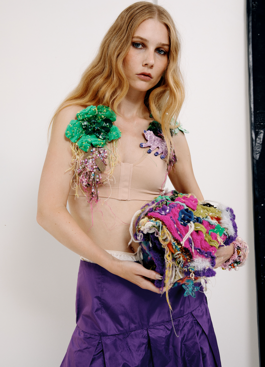 Classically trained in those two métiers d'arts, her techniques, associated with thrifting for the rarest source materials, shape unique accessories: Gems.