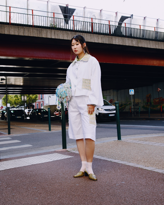 Mathilde Hiron is a French designer, weaving precious threads from fashion houses deadstocks and sculpting dreamy ceramic jewels.
